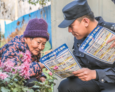 安徽省马鞍山市和县公安局善厚派出所民警向老年人开展防范养老诈骗宣传活动。杨杉杉摄(影像中国)