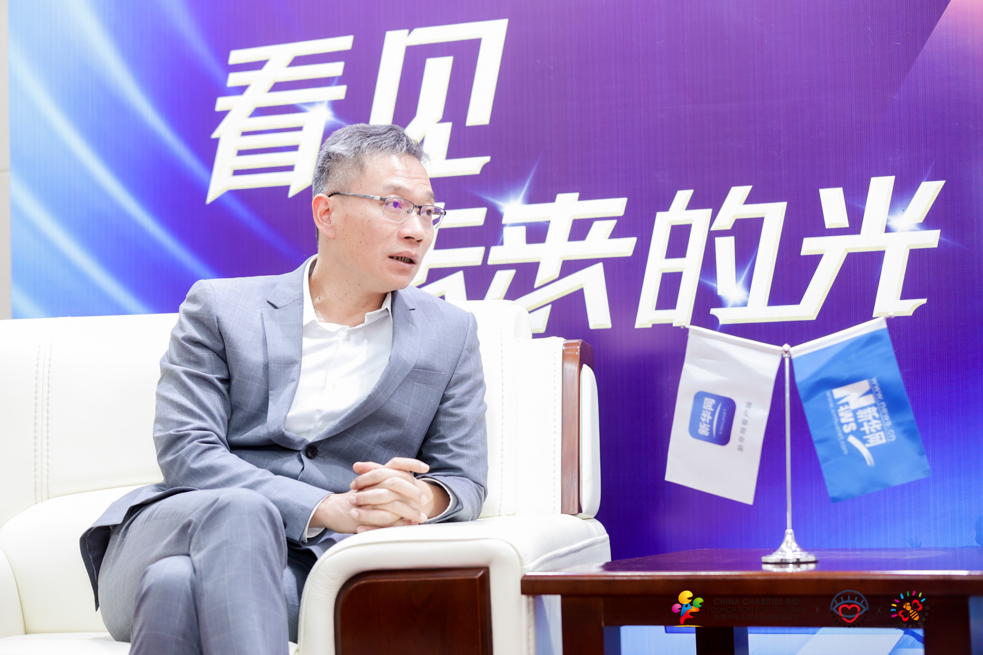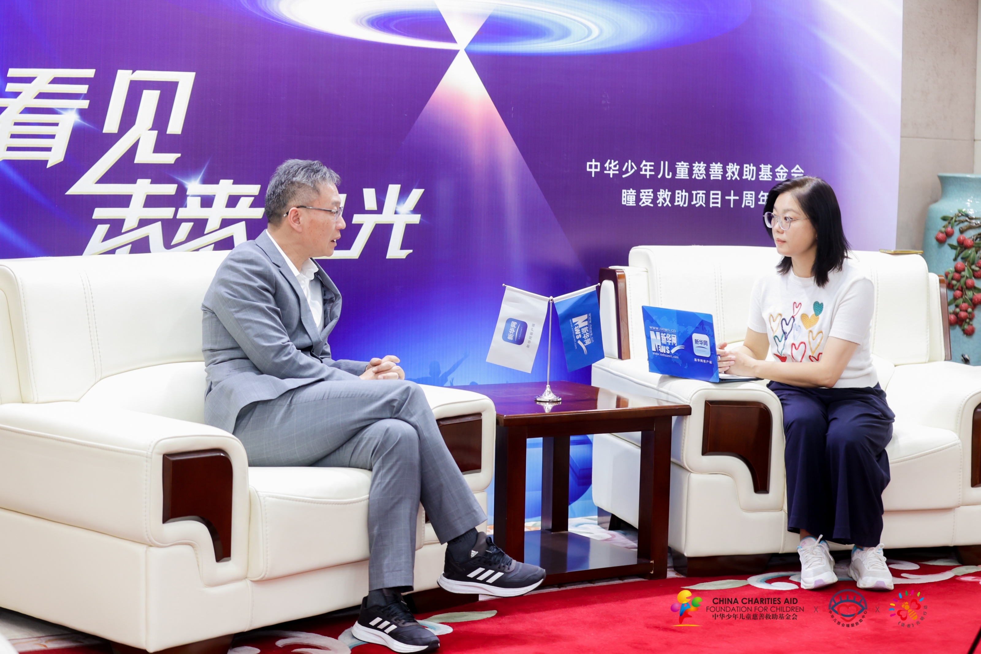 图为李晓峰(左)在中华儿慈会瞳爱救助项目十周年活动后接受新华网公益频道记者采访 新华网发