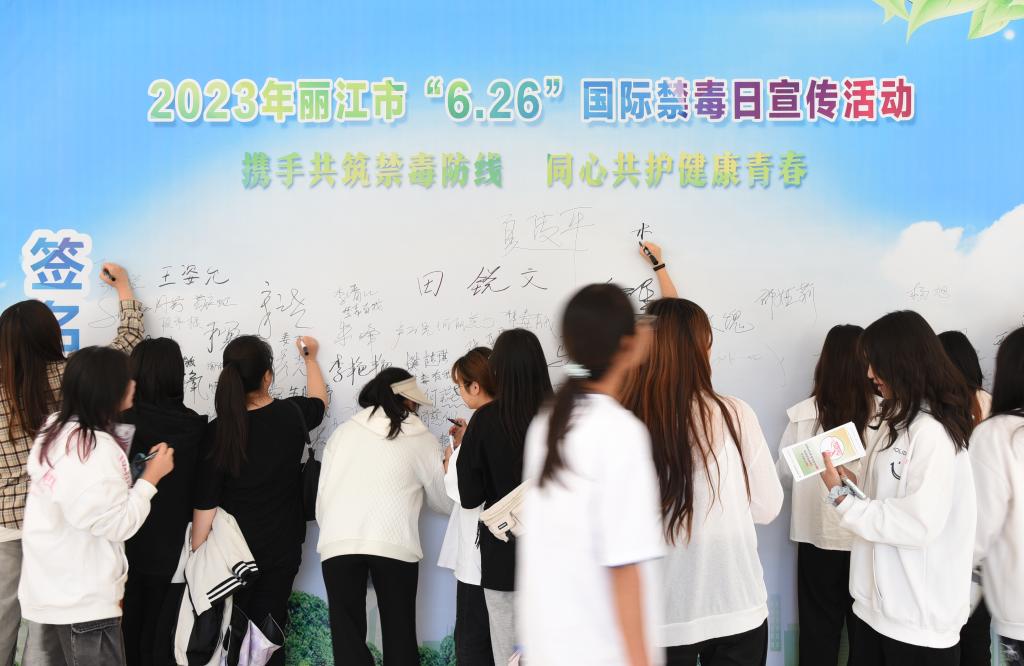 6月26日,在云南丽江师范高等专科学校,学生在拒绝毒品签名墙上郑重签名。