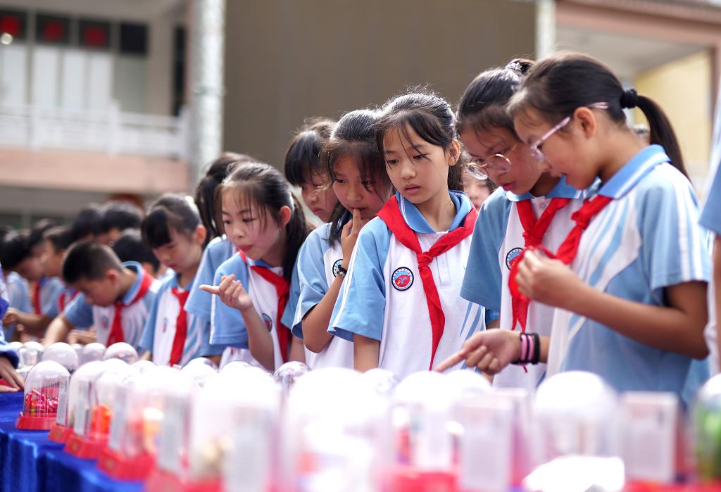 6月26日,小学生在贵州省黔东南苗族侗族自治州丹寨县“6.26国际禁毒日”宣传教育活动现场通过仿真毒品模型识别毒品。