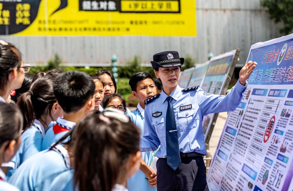 6月26日,民警在河北省唐山市向学生宣传禁毒知识。