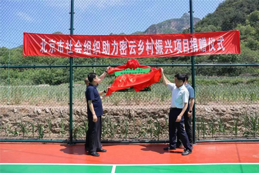 北京市社会组织管理中心副主任李仁利和密云区委社会工委书记、民政局长孙绍志共同为东田各庄村文体活动室、杨家堡村篮球场揭牌。