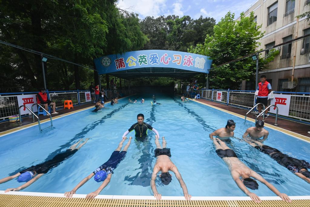 7月26日,国家中级游泳救生员、体育老师徐刚强(右一)在“蒲公英爱心习泳馆”暑期爱心公益游泳班教孩子们防溺水知识。