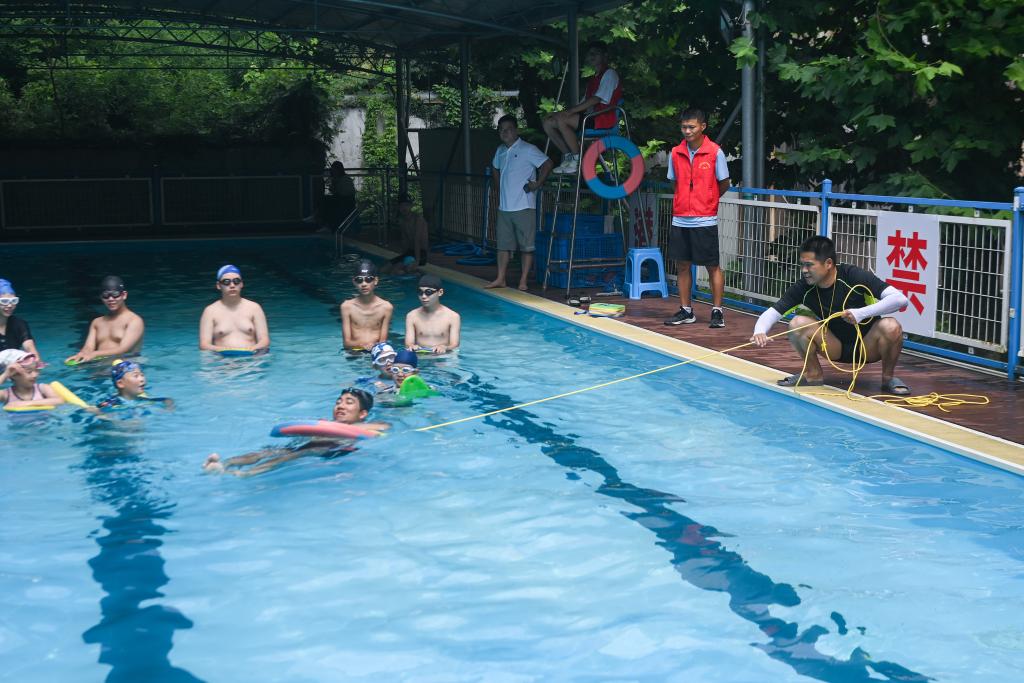 7月26日,国家中级游泳救生员、体育老师徐刚强(右一)在“蒲公英爱心习泳馆”暑期爱心公益游泳班现场模拟溺水营救。