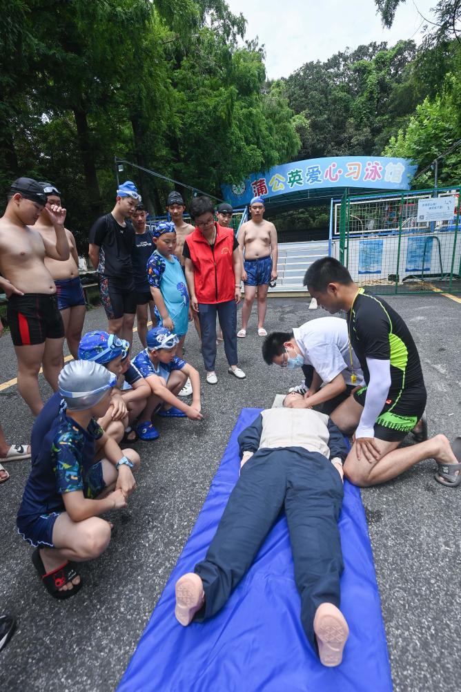 7月26日,道场乡卫生院的医生和志愿者老师在“蒲公英爱心习泳馆”暑期爱心公益游泳班教孩子们心肺复苏的规范操作步骤。