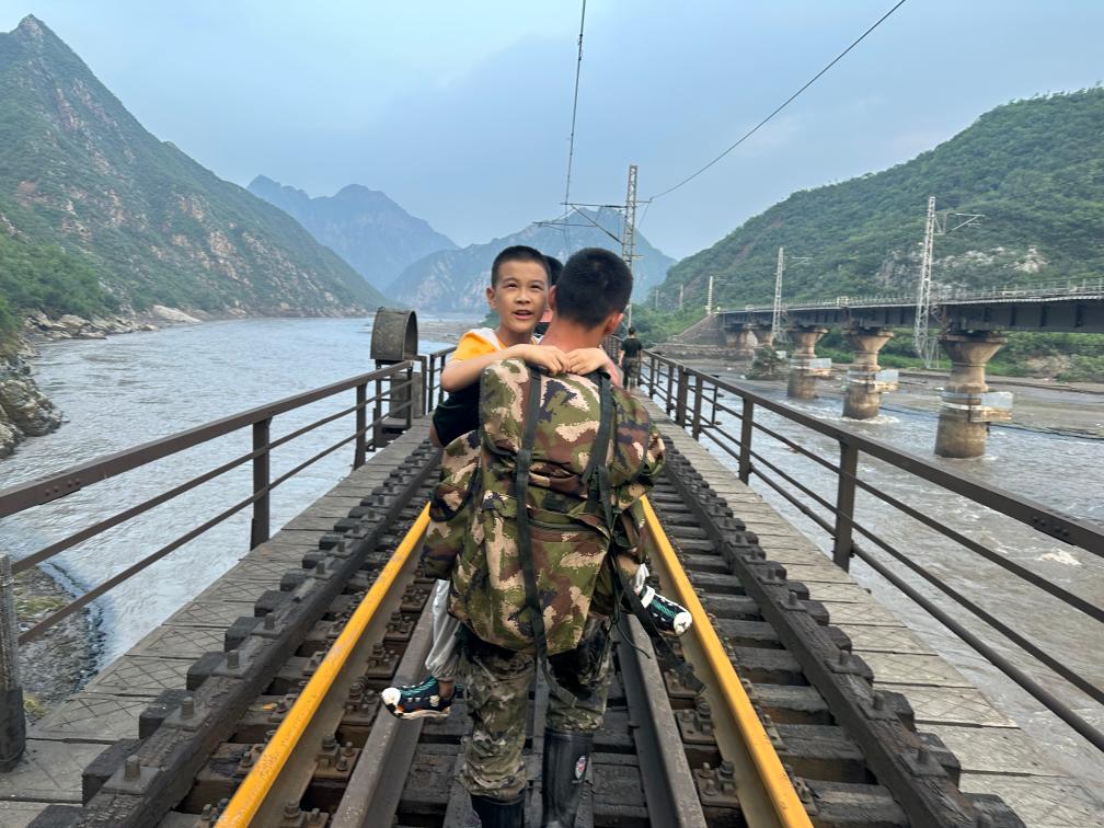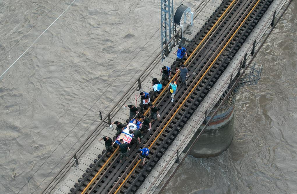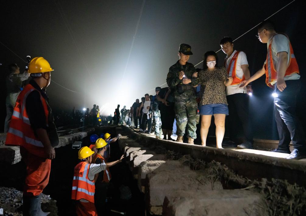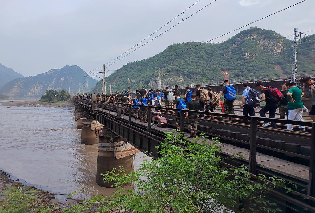 8月2日,Z180次受困列车的旅客在武警北京总队机动第三支队官兵的帮助下徒步前往转运客车(手机照片)。