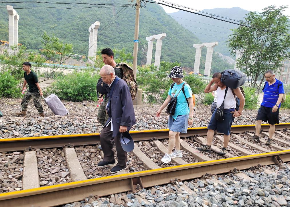 8月2日,Z180次受困列车的旅客离开安家庄临时安置点徒步前往转运客车(手机照片)。