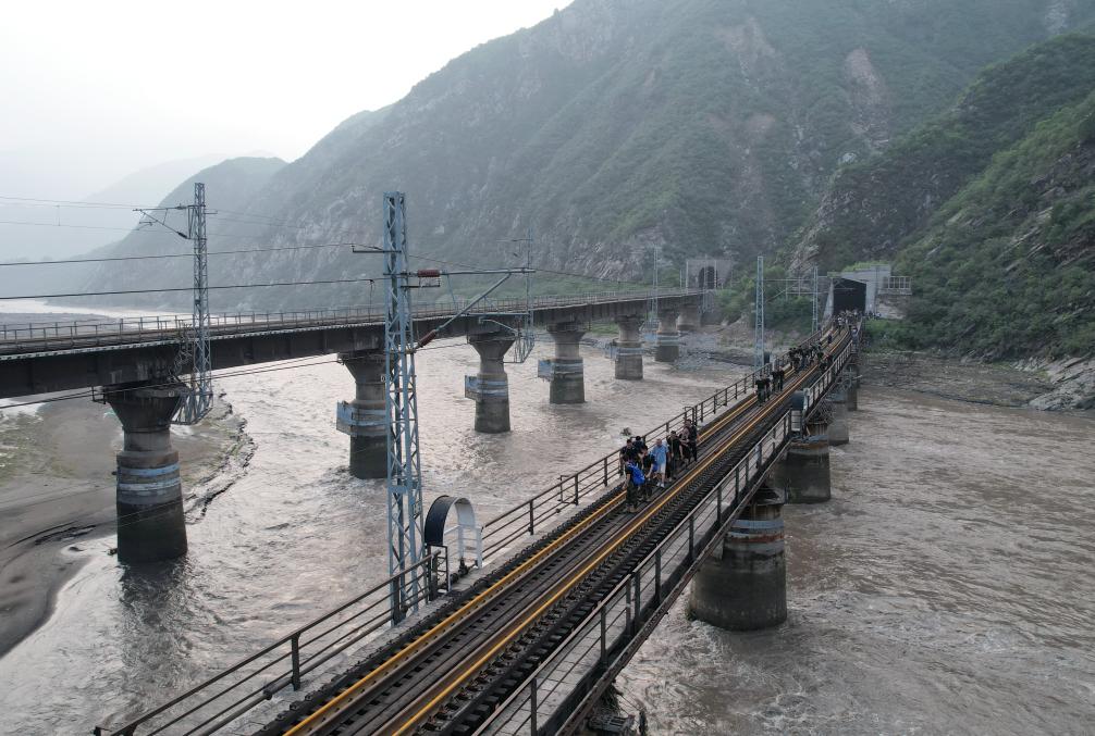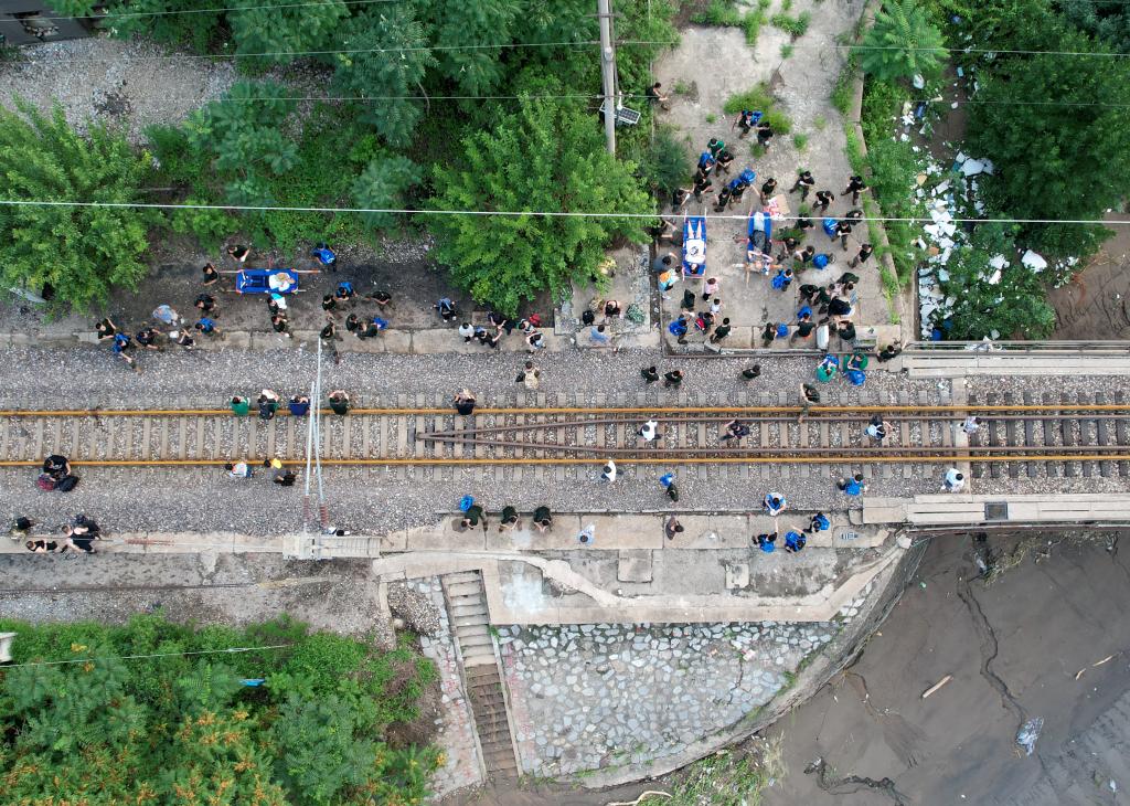 8月2日,受困列车旅客在救援人员帮助下徒步赶往转运客车(无人机照片)。