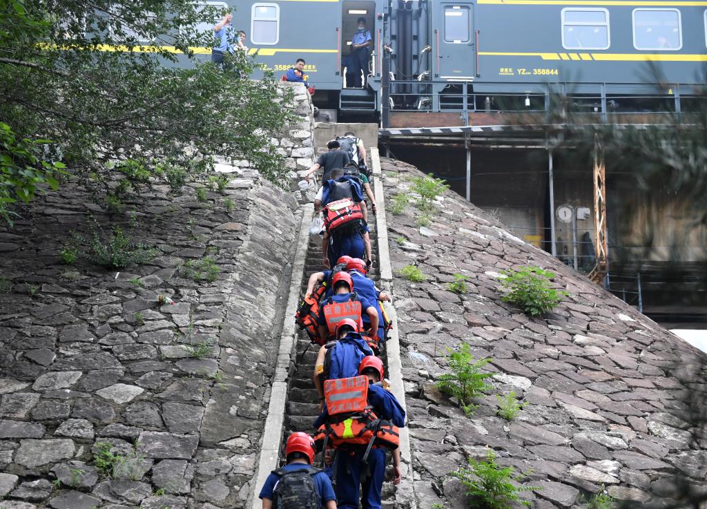 8月2日,来自门头沟区、顺义区消防救援支队的救援人员乘车前往距离滞留旅客最近的车站。
