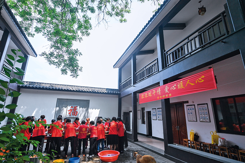浙江省诸暨市安华镇球山村的爱心食堂,镇村妇联、团委等部门的志愿者们为镇村 8 个爱心食堂和全镇独居老人们包粽子、蒸茶叶蛋(2023年6月7日摄) 徐昱摄/本刊