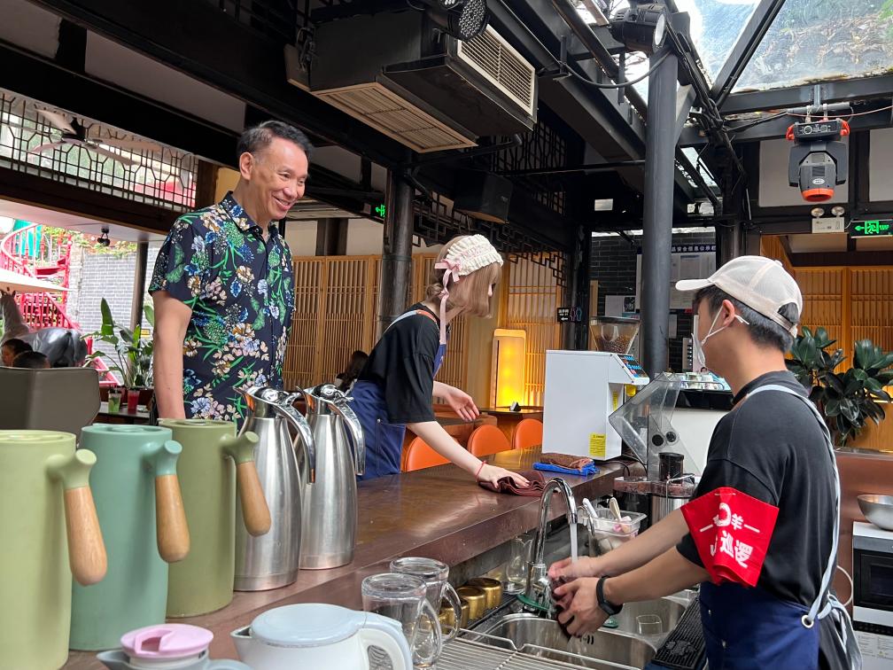 蔡大伟(左一)在餐饮店里和店员交流。新华社记者袁秋岳摄
