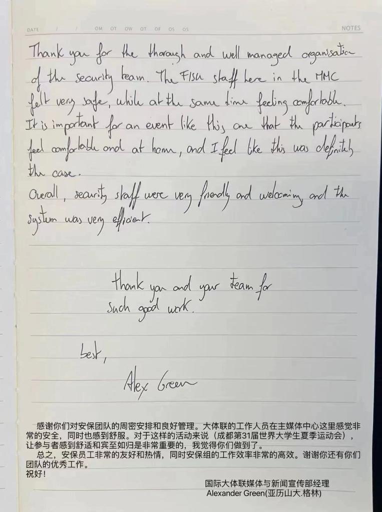 离别在即,国际大体联媒体与新闻宣传部经理格林深有感触地说,感谢安保工作的有序组织和良好管理,让国际大体联的工作人员感觉非常安全,同时也感到很舒服。“在这样的大型盛会中,能让参与者宾至如归是非常重要的,我觉得成都做到了。”格林说。