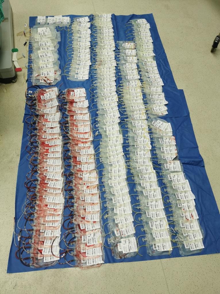 在羊水栓塞患者的救治中,输血治疗也尤为重要。在此次抢救中,南宁中心血站共计供应红细胞154单位、血小板12个治疗量、新鲜冰冻血浆23480毫升、冷沉淀216单位,抢救用血约合6.75万毫升。