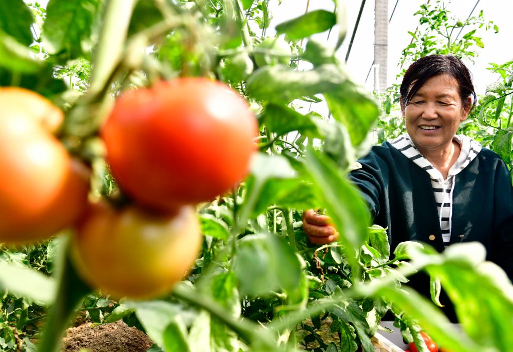 10月11日,村民在山东省惠民县奥丰瓜菜种植专业合作社蔬菜大棚采摘西红柿。