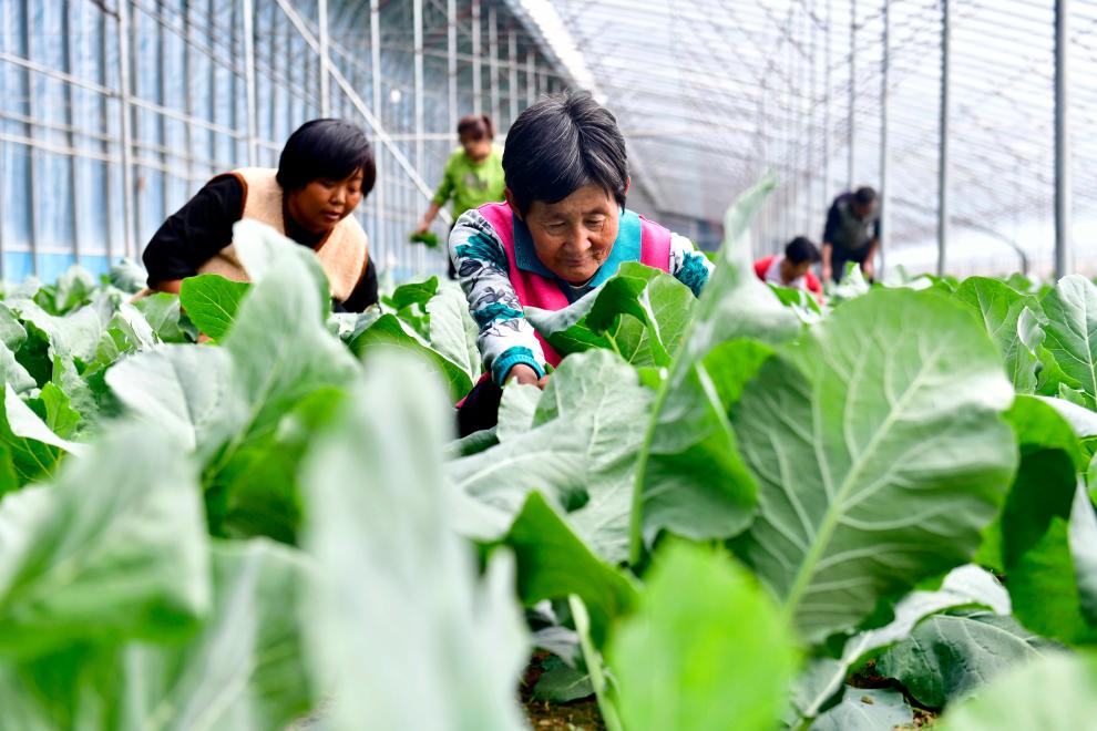 10月11日,村民在山东省惠民县奥丰瓜菜种植专业合作社蔬菜大棚管护蔬菜。