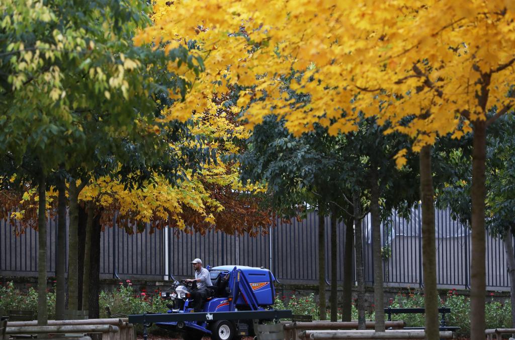 2020年10月23日,一名工人在法国巴黎卢森堡公园驾驶作业车辆。新华社记者高静摄