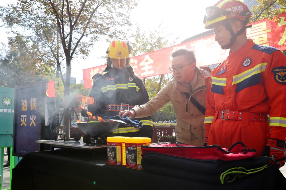 11月13日,市民(中)在消防员指导下进行厨房油锅灭火体验。