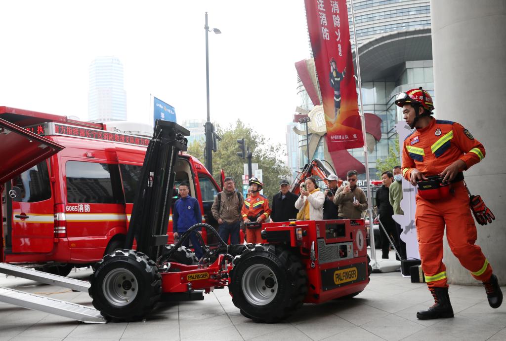 11月13日,消防员(右)在活动现场进行折叠式遥控救援叉车的机动演示。