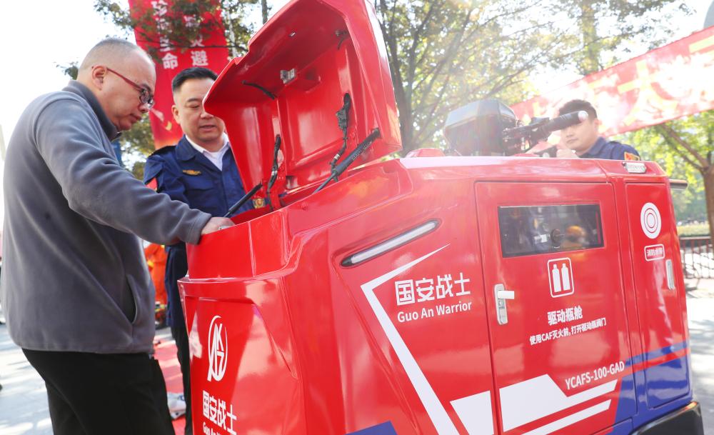 11月13日,市民(左)在向工作人员了解一个微型移动式灭火装置的操作方式。