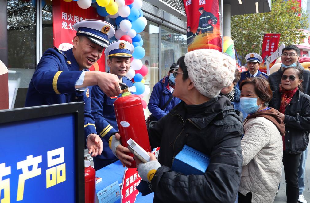 11月13日,消防宣传工作人员将现场展示的一支灭火器送给参观的市民。