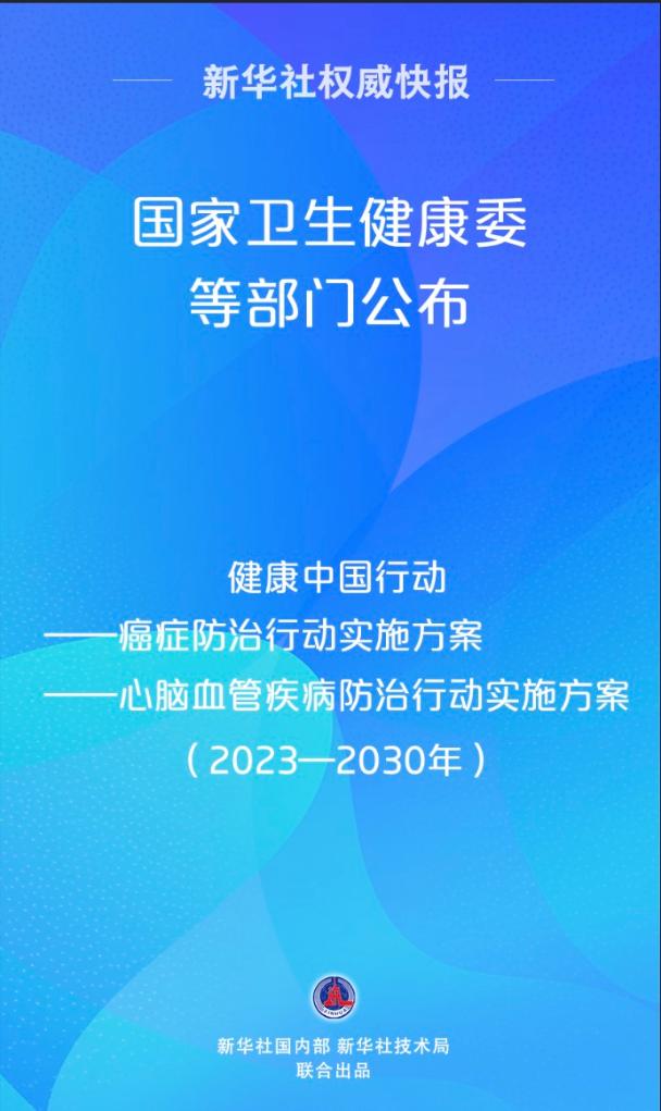 国家卫生健康委等多个部门联合制定公布《健康中国行动—癌症防治行动实施方案(2023—2030年)》《健康中国行动—心脑血管疾病防治行动实施方案(2023—2030年)》。