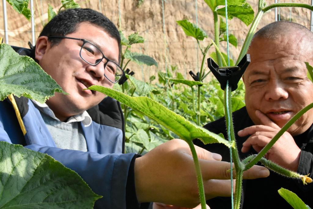 魏忠孝(右)在和农技专家王震一起检查大棚黄瓜长势。新华社记者郑昕 摄
