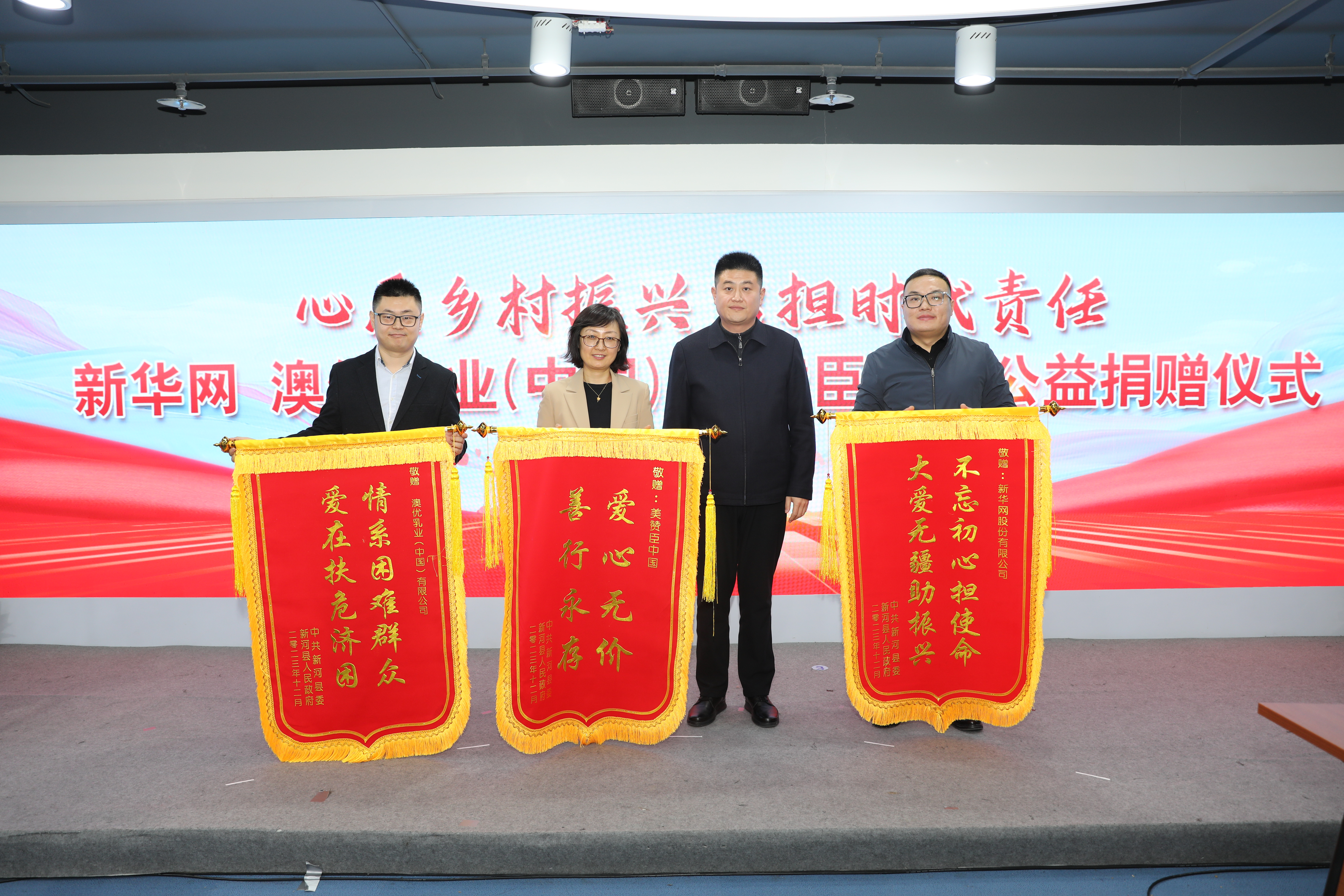 新河县人民政府副县长关兵向澳优乳业、美赞臣中国、新华网赠送锦旗
