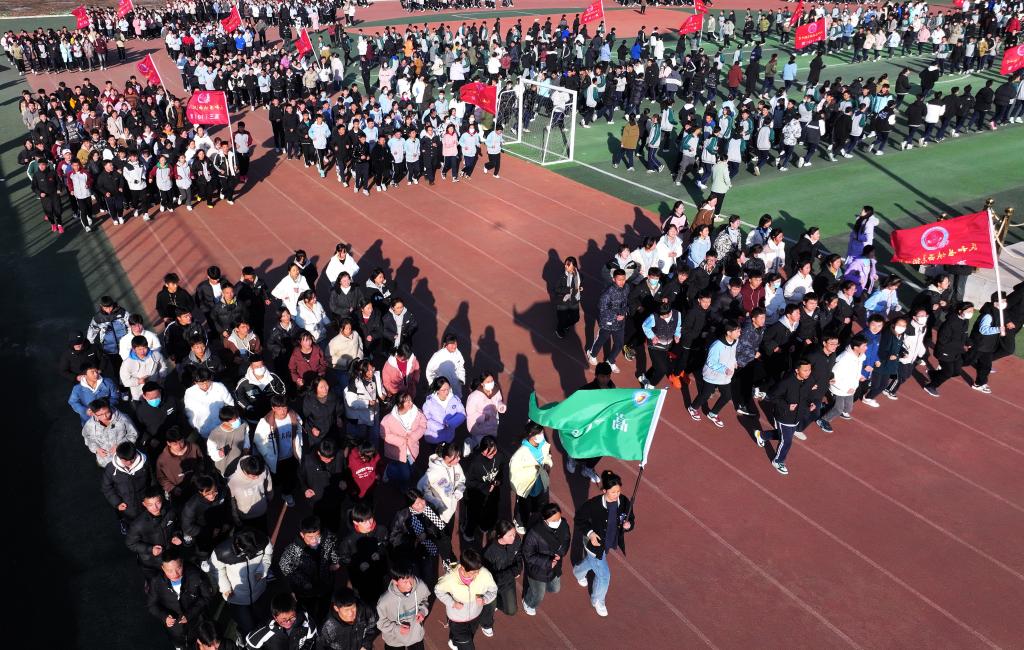 12月25日,来自民和县官亭土族中学的学生在民和县城西高级中学的操场上跑操(无人机照片)。新华社记者 王浡 摄