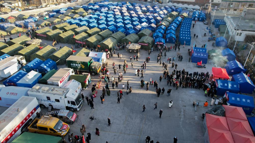24日中午,冬日暖阳模式下,朔风收敛了寒意。大河家镇大河村广场安置了2000多户本村及周边受灾群众,是积石山6.2级地震甘肃灾区最大的灾后集中安置点之一。安置点上帐篷林立,爱心牛肉面摊、心理疏导学校、物资分发点前人头攒动。