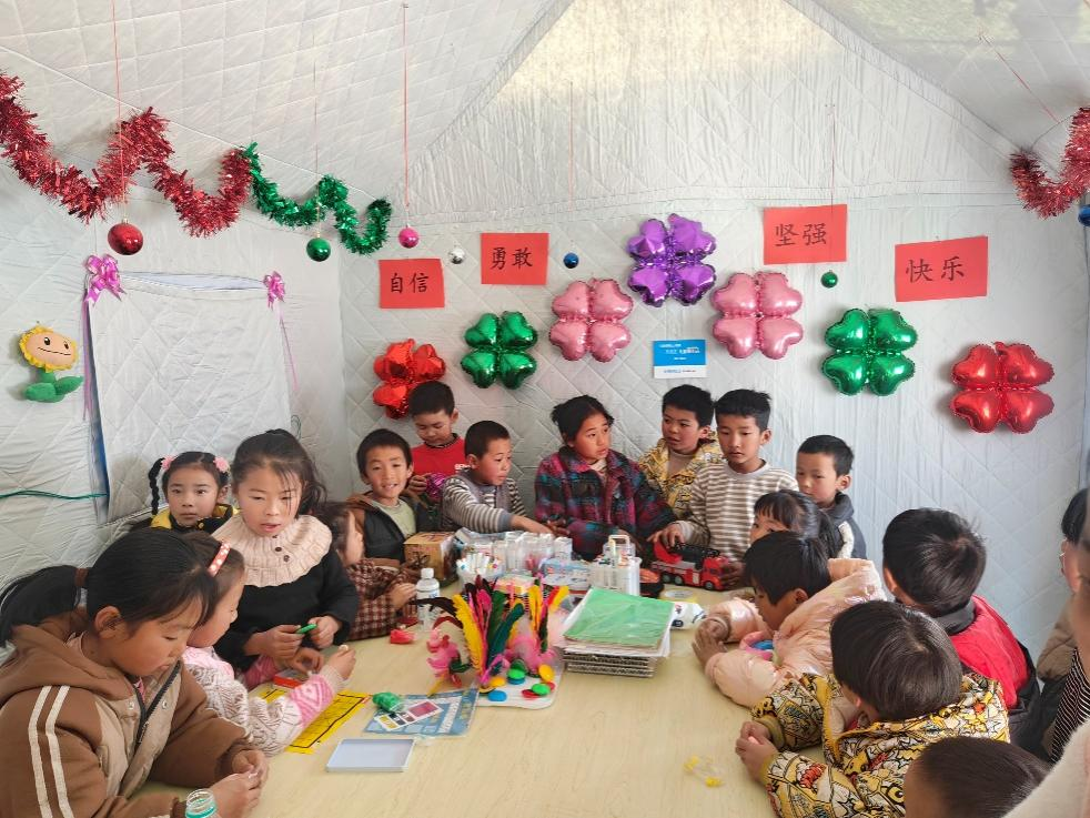 为减少地震对受灾村镇儿童的心理影响,甘肃积石山县地震发生一个多月来,壹基金在开展灾害救援的同时,联合甘肃、青海当地社会组织伙伴,在甘肃省积石山县建立4个灾后益童乐园和15个灾后儿童服务站,在青海省海东市建立5个灾后儿童服务站。