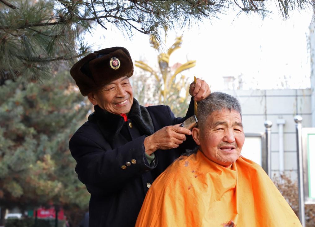 这是“义务理发师”贾潮江(左)(2023年12月12日摄)。