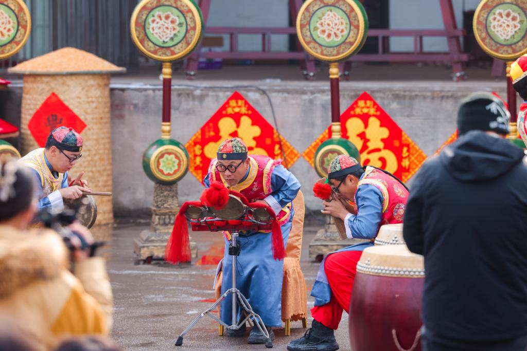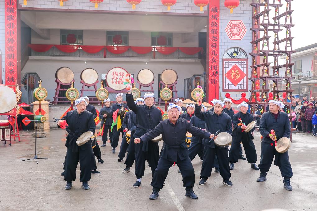 非遗系列表演是本场“村晚”的主打节目,锣鼓《秦王点兵》、鼓乐表演《老鼠娶亲》、龙狮闹村晚……这些节目极具乡土特色,演员、剧务、导演全部由本地村民自己担任。几百村民围在戏场里,兴致勃勃地看着熟悉的身边人粉墨登场,一招一式有模有样,现场喝彩声、掌声、欢笑声此起彼伏。