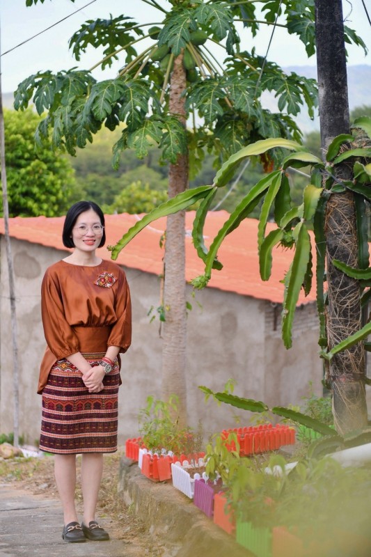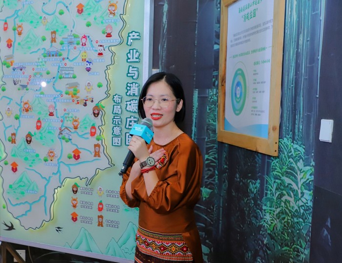 关键人物的其中之一,是如今任职毛道乡党委书记的黄凌凤。2023年7月27日,“消碳庄园”项目交流会当天,她穿着一身以当地黎族非遗纺染织绣的传统黎锦筒裙,向来宾讲述关于这座小村落充满能量的现在与未来。