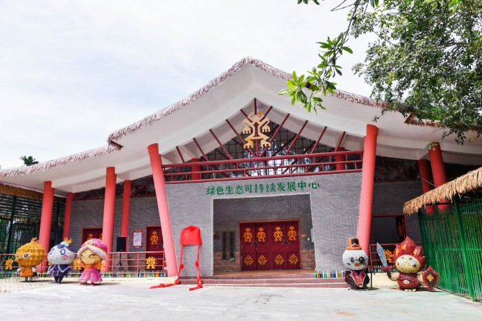 当你走近环保中心,会看见门口站着五个巨大的彩色玩偶,是村民和环保志愿者用秸秆编织好,再刷上不同的颜料,生动有趣。黄凌凤给它们取的名字是“五小只”,组成的是一个“水果王国”的IP:榴莲国王、山竹王后、百香果公主、火龙果将军、龙眼公爵。