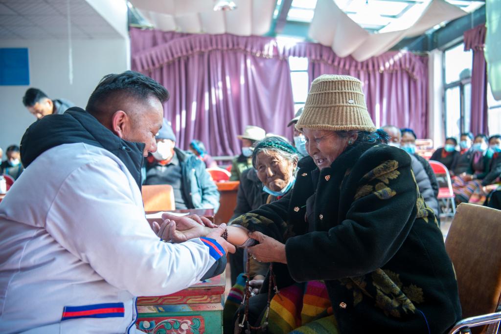 1月27日,加央医生在给曲珍老人把脉。新华社记者 刘文博 摄