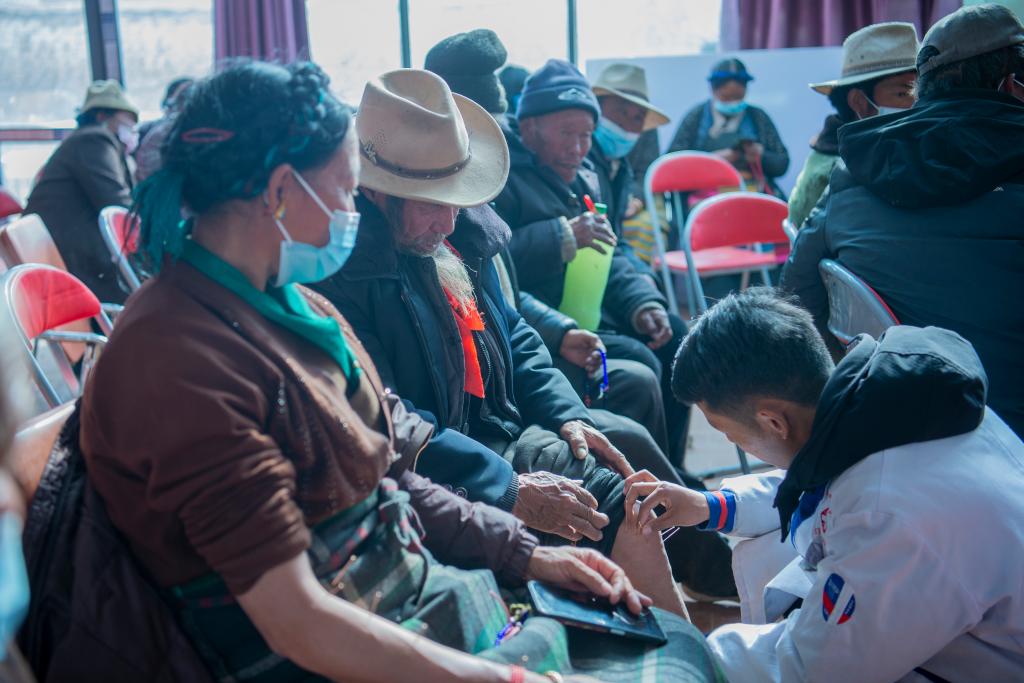屋子里,医生加央正耐心询问村民病情,他的同事们在为村民们发放药物。加央是日喀则市边那仓藏医院的负责人,也是边那仓志愿义诊队的组织者。