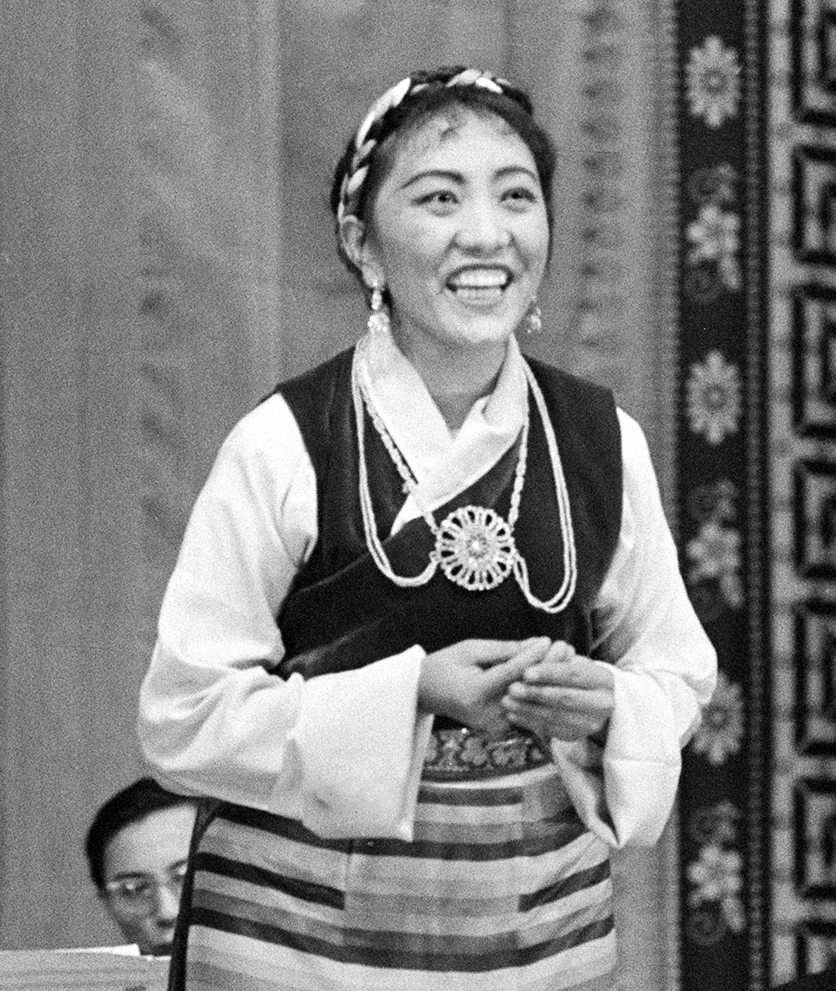 藏族歌唱家才旦卓玛在演唱《唱支山歌给党听》。新华社记者 宁凡 摄(1963年12月16日发)