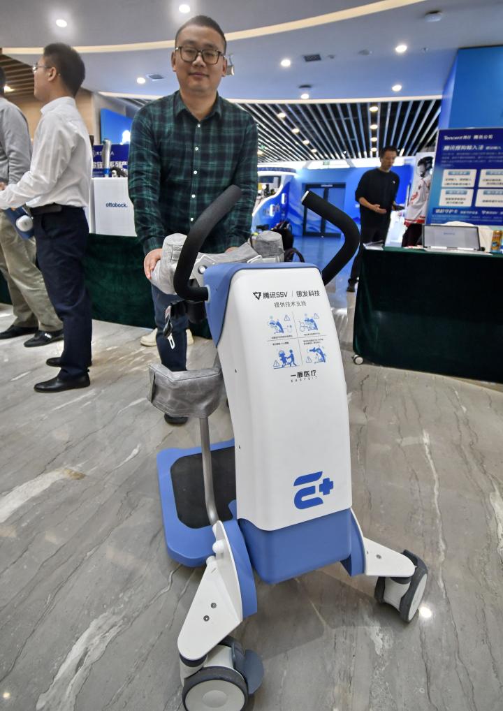 3月13日,参展企业的工作人员在展会上展示一款国产智能康复设备。