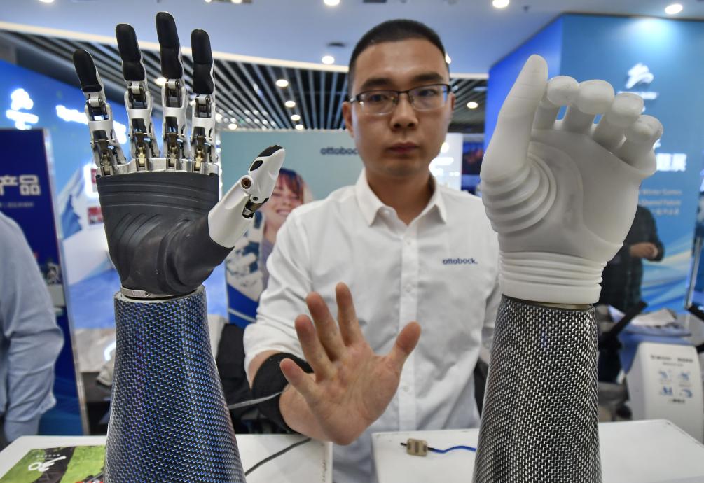 3月13日,北京一家智能机械设备企业展示他们的专供残疾人使用的机械手。