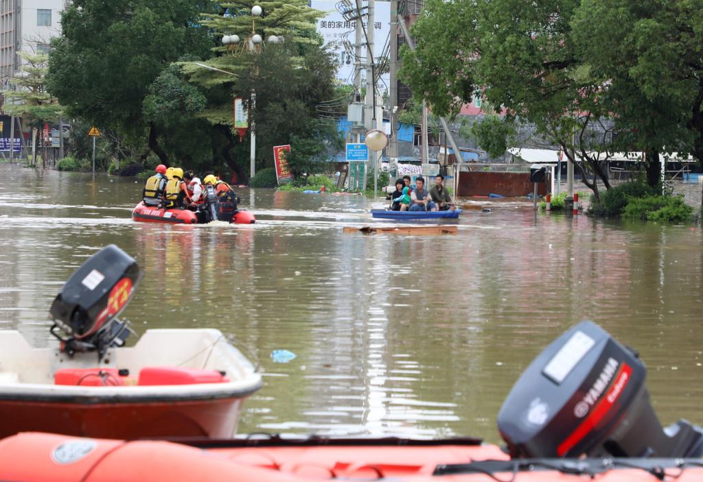 广东清远英德市部分乡镇在此次洪水中受灾严重。21日下午,记者在清远英德市浛洸镇358国道看到,道路被水淹没,街道两边不少商铺浸泡在水中,水深处约有一层楼高,不时有消防、应急等救援抢险部门的冲锋舟、橡皮艇来往转运群众。