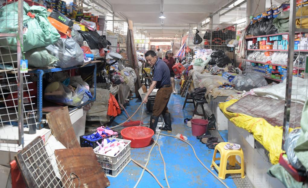 4月21日,洪水过后,广东省韶关市武江区龙归镇的居民在清理店铺。