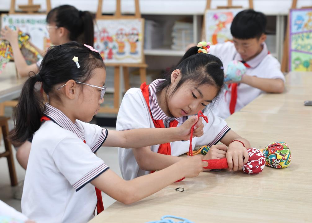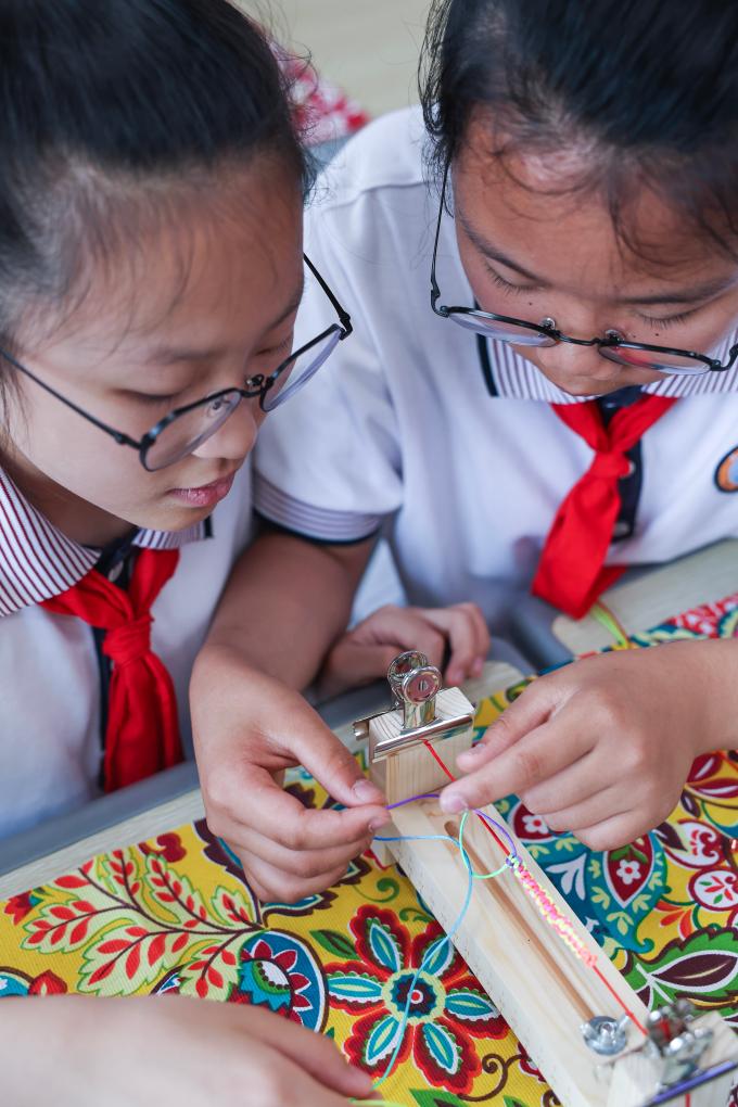5月22日,太湖小学的学生们在特色课程上学习端午“五彩绳”的编织。