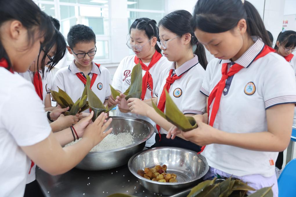 5月22日,太湖小学的学生们在特色课程上学习包粽子。