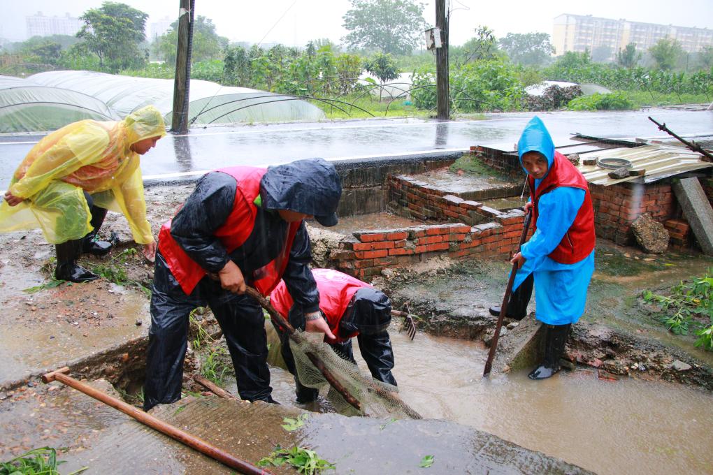 当天凌晨5时,联民村排涝站便启动了两台机组紧急向外河排水。全村830多亩耕地和菜地,低洼处难免有积水。“大雨连下了两天,再不排水,菜根马上就要烂,农民这半年就白忙活了。”老党员熊国华焦急挥动着铁耙,沿着沟渠边走边疏堵,“看到草就勾住拖过来,捞出淤泥,才能畅通排水,避免菜地长时间被淹。”