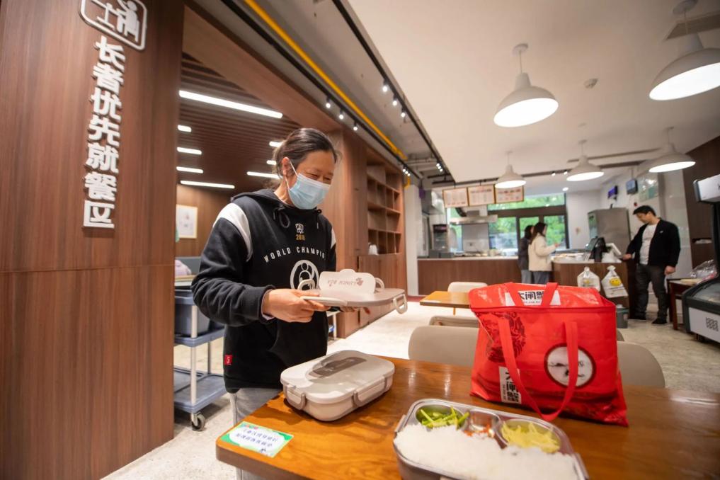 浙江宁波市江北区大闸社区社工在共享食堂打包午饭准备为老年人送餐 江汉 摄