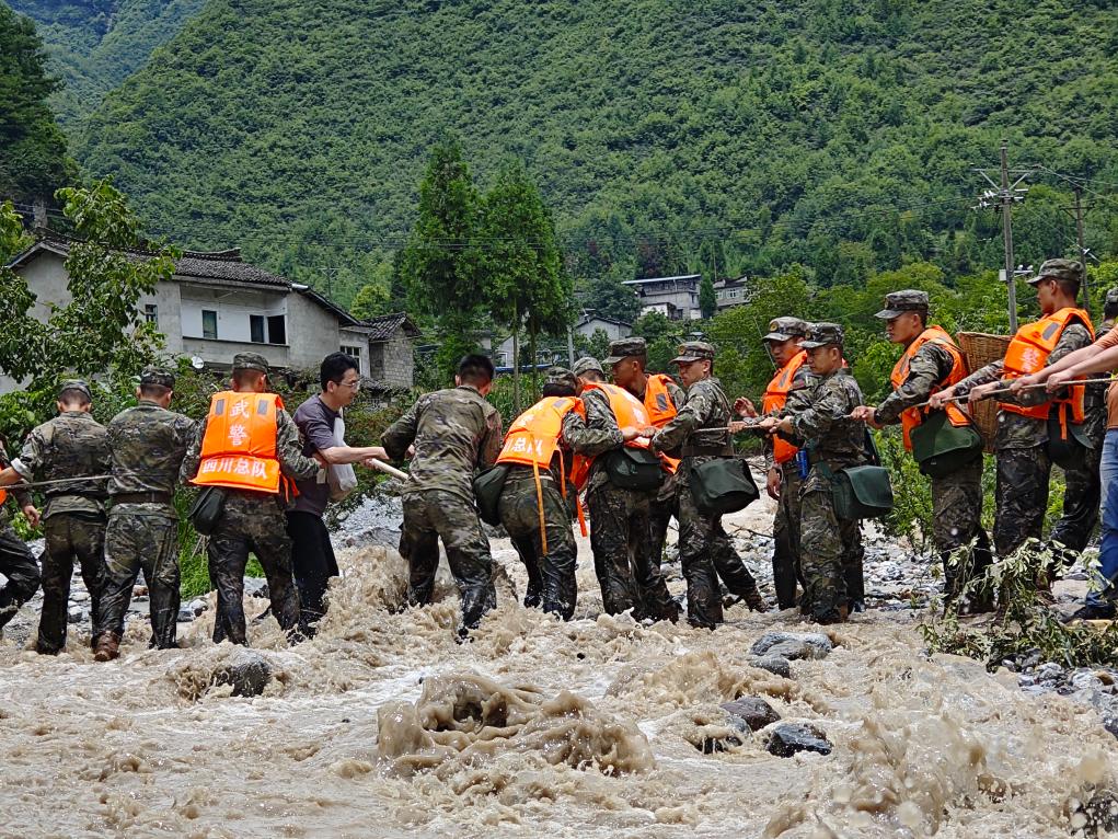 7月21日,在四川省雅安市汉源县马烈乡新华村,武警四川总队雅安支队官兵转移受困群众时搭建人墙,确保受灾群众安全过河。