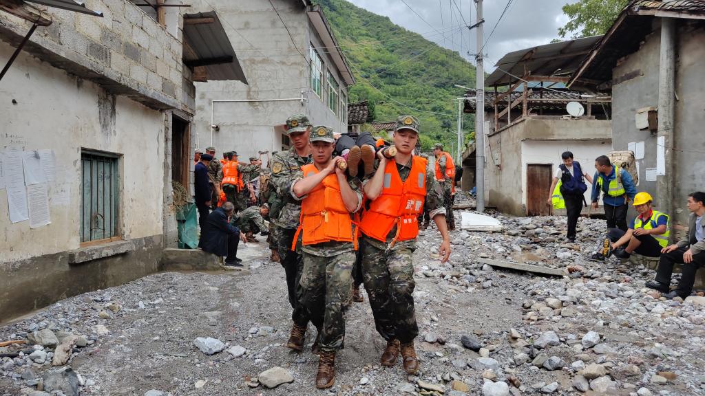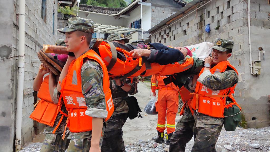 7月21日,在四川省雅安市汉源县马烈乡新华村,武警四川总队雅安支队官兵转移受灾群众。