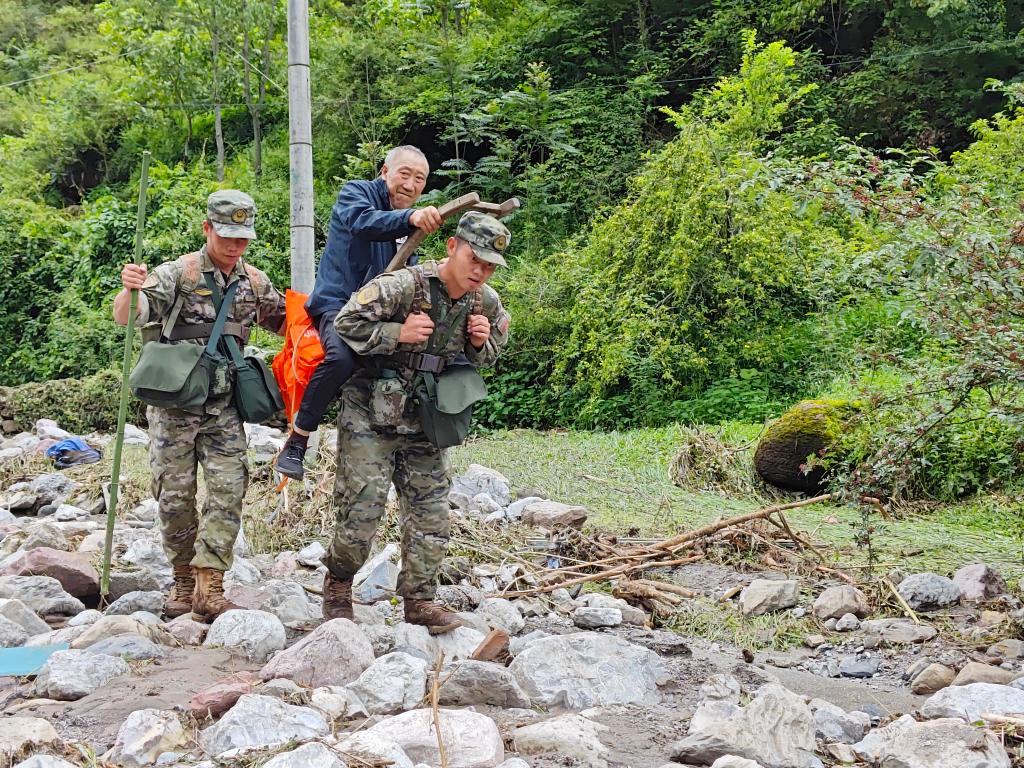 7月21日,在四川省雅安市汉源县马烈乡新华村,武警四川总队雅安支队官兵背着受伤老人穿过乱石河滩。
