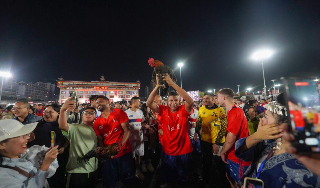 跨越千山万水前来参加“村超”比赛的巴西圣保罗高桥足球队,在先后赢得贵阳红润化工足球队、青海玉树牦牛足球队、澳体会国际足球队的三场比赛中收获了“村超”欢乐,也用精彩的桑巴足球,给现场游客带来了快乐。