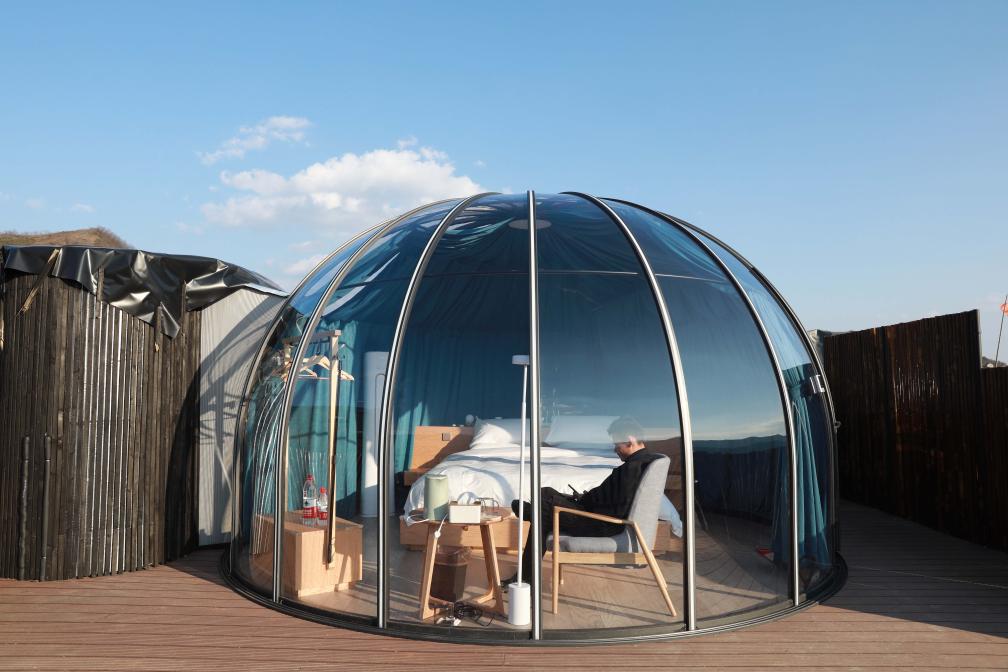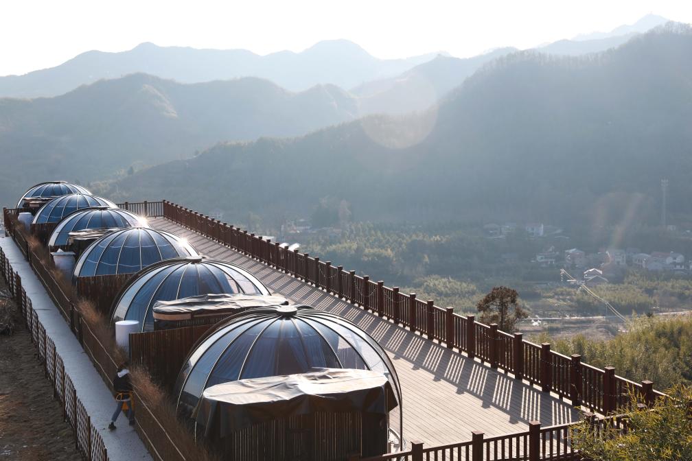 ↑2022年2月26日拍摄的浙江省杭州市临安区天目山镇一都村星空“泡泡屋”。CICPHOTO/胡剑欢 摄